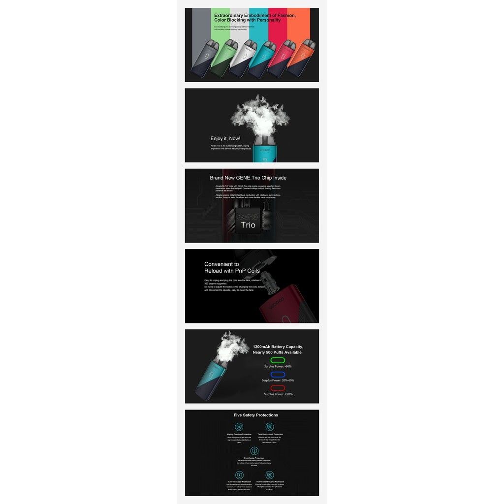 VOOPOO Find S Trio Kit is a stunning combination of eye-catching design styles and contrast colors in strong personality. Powered by a built-in 1200mAh battery, it integrates the brand-new Gene.Trio chip, featuring an output range of 6-23W and allowing for almost 500 puffs on a full charge. Operationally, the kit is activated by a single power button. Simply press the button, the vapor will be producted immediately. Around the button is a battery life indicator light. It glows in three colors to indicate the battery level, green for above 60%, blue for 60-20% and red for below 20%. As for the pod, it features a capacity of 3ml(2ml for TPD version) and a bottom-fill structure. There are two kinds of coil head options, one is the 0.8ohm regular coil head, the other is a 1.2ohm ceramic coil head. Both of them can be replaced effortlessly thanks to the PnP design. Anyway, the Find S Trio is an ideal choice for both MTL and DTL vaping. 6 colors to choose from.